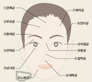 얼굴속의 12개의 복권이라고 일컬어지는 관록궁, 부모궁, 형제궁, 전택궁, 남녀궁, 노복궁, 복덕궁, 천이궁, 처첩궁, 명궁, 질액궁, 재백궁 등 12궁에 관한 것입니다. 12궁은 관상의 기본이다. 동양학에서 눈으로 보이지 않는 오장육부의 문제점이 외부로 나타나는 것과 같다는 것이지요.