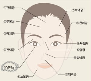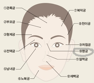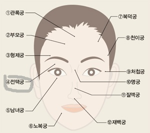 • 머리끝에서 눈썹까지 윗마당으로 30년세 까지의 초년운