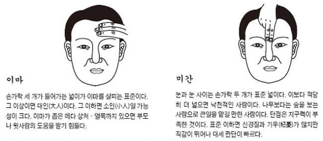 • 이마 : 하늘이다 초년 운과 부모의 운이다
