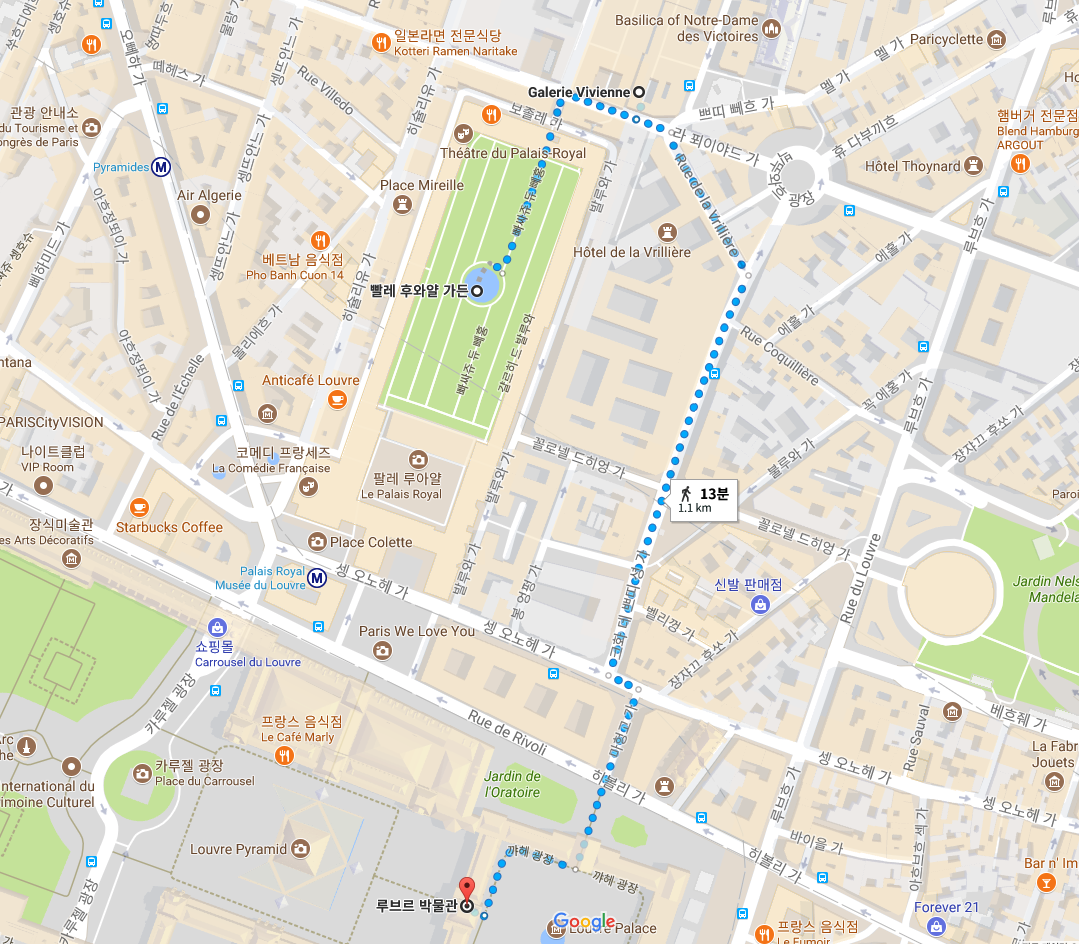 일정상으로는 루브르 박물관을 관람 후 왕궁정원(Jardin du Palais Royal)과 비비안 갤러리를 둘러볼 예정이다.먼저 왕궁정원은 루브르 박물관과 멀지 않은곳에 위치하고 있지만 점심 먹을 시간과 약간 겹친다.이럴때 현지상화을 판단하여 이동하자.