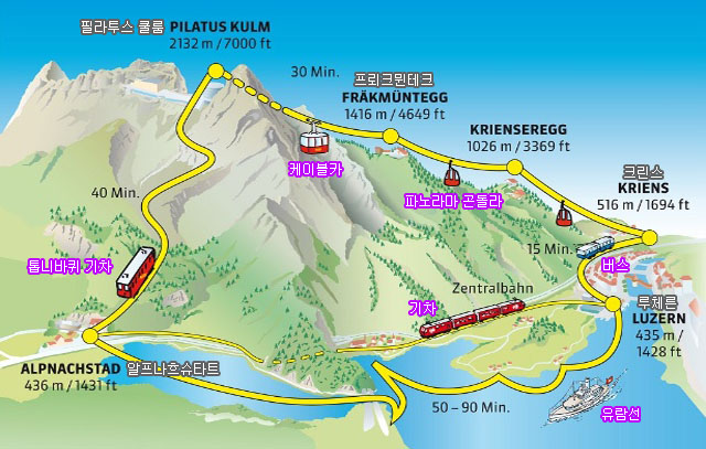 루체른 → 열차 → 아쓰골다우(Arth Goldau) → 산악열차 → 리기콜륨(Rigi Kuim)정상 → 산악열차 → 비츠나우(Vitznau) → 유람선 → 루체른(Luzern)