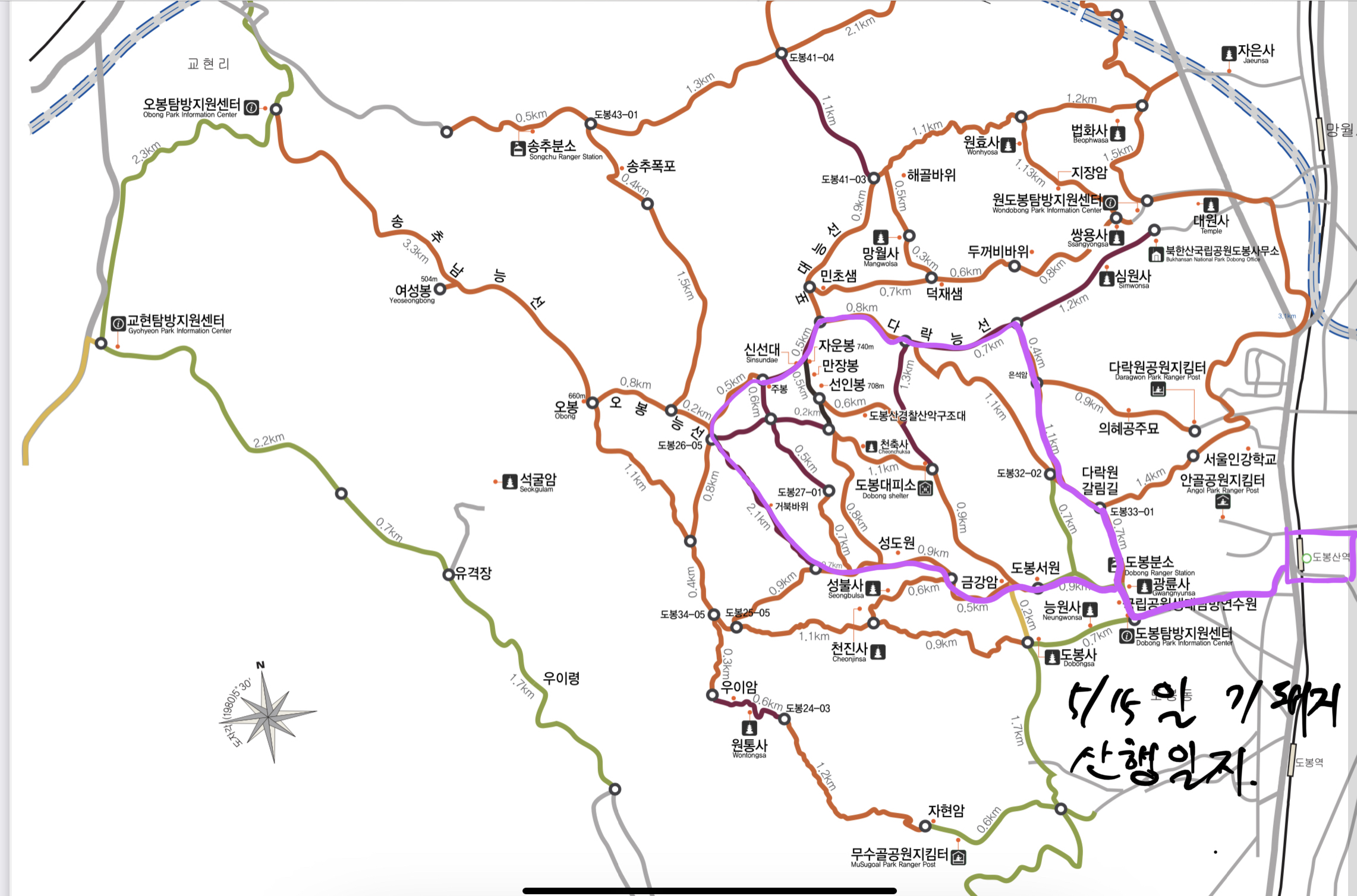 만약 원점회귀로 가지않고 오봉능선을 타면 오봉탐방지원센터로 빠짐.