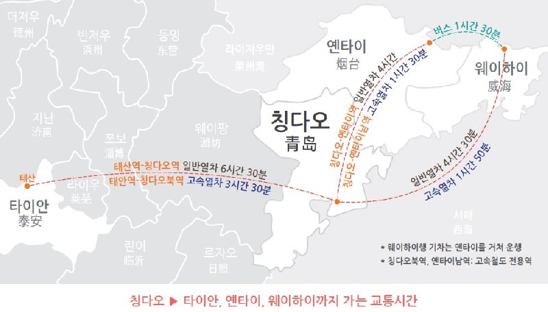 - 칭다오는 바닷가가 인접하고 일찍이 외국 문물을 받아들인 곳으로, 산동성의 관문으로 손꼽힌다. 그렇기에 현재도 산동성 내 다른 도시를 방문하려면 일단 칭다오를 방문한 뒤 이동하는 방법이 가장 편리한 편. 칭다오를 기점으로 각 도시를 찾아가려면 주로 기차를 이용하면 되고, 근교라면 버스를 추천한다. 2014년 12월 28일을 기점으로 칭다오青岛에서 룽청荣成까지 오가는 고속철도가 개통되어 옌타이烟台와 웨이하이威海 여행에 더욱 시간을 아낄 수 있게 되었다. 산동성 주요 도시가 고속철도로 1시간 생활권이 되며 여행자들의 편리성이 증대되는 것은 물론, 더 나은 산동성 발전을 기대할 수 있게 된 것이다. 고속철도가 이번에 새롭게 개통되었지만, 아직 칭다오에서 타이안, 옌타이, 웨이하이까지 가는 직항 비행 노선은 없다.