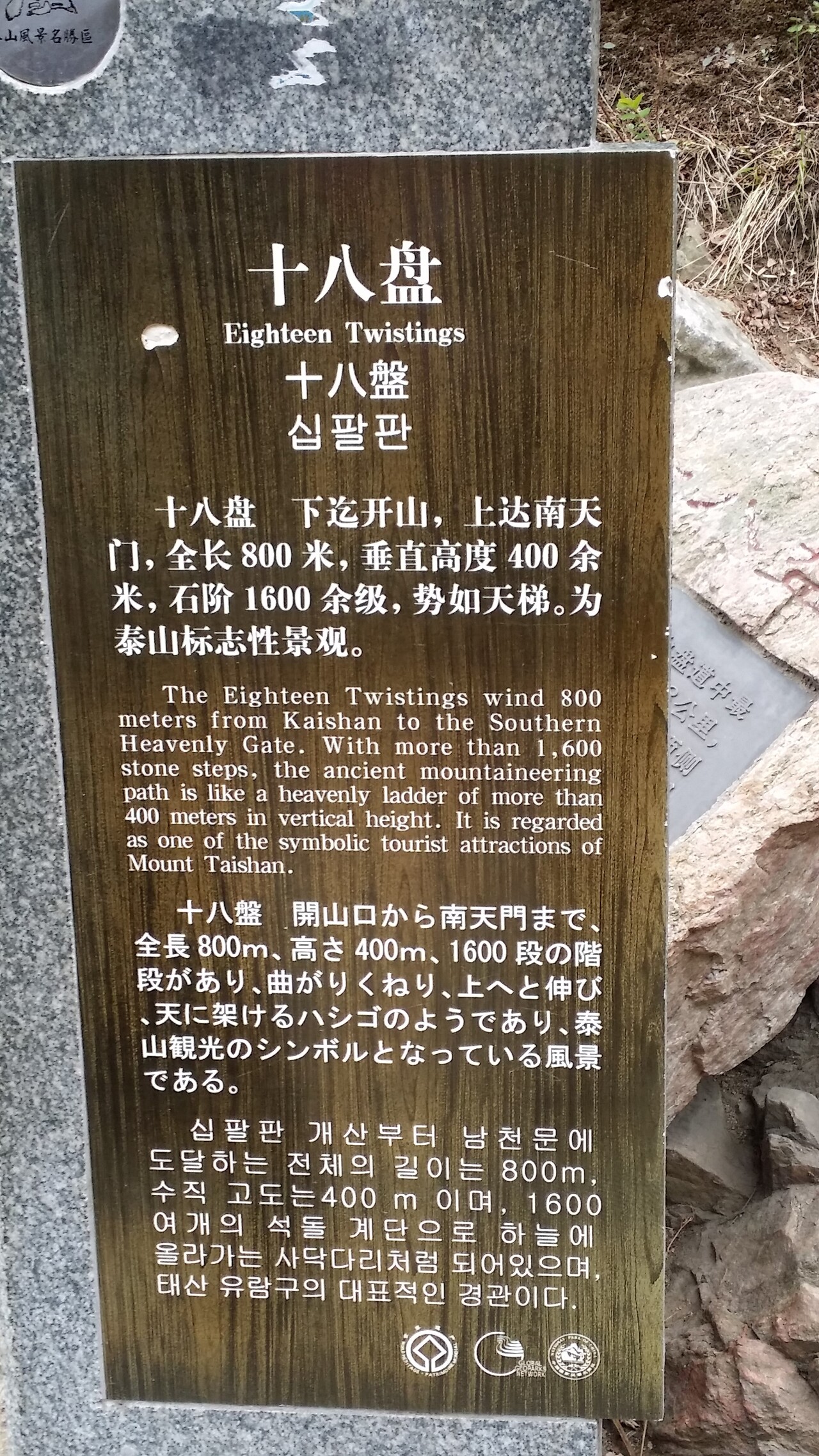 - 케이블카를 타며 십분 이면 남천 문까지 가는데 계단으로 오르면 800m의 계단 길로 해발 400m를 단숨에 올라야 하는 1600개의 급경사 돌계단인 '십팔반'은 태산 최대의 난코스이기도 합니다.