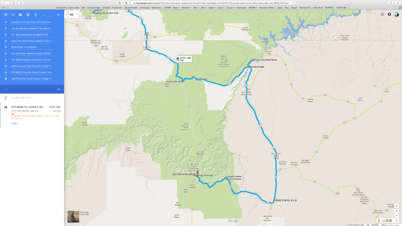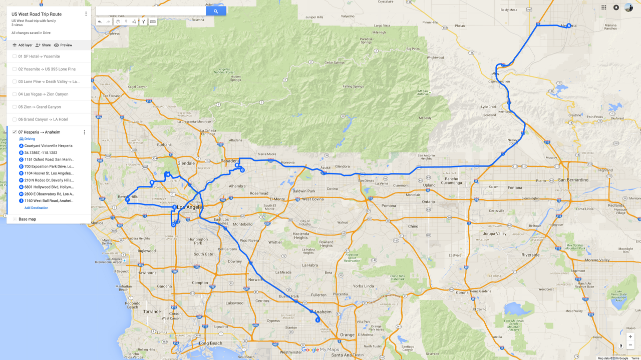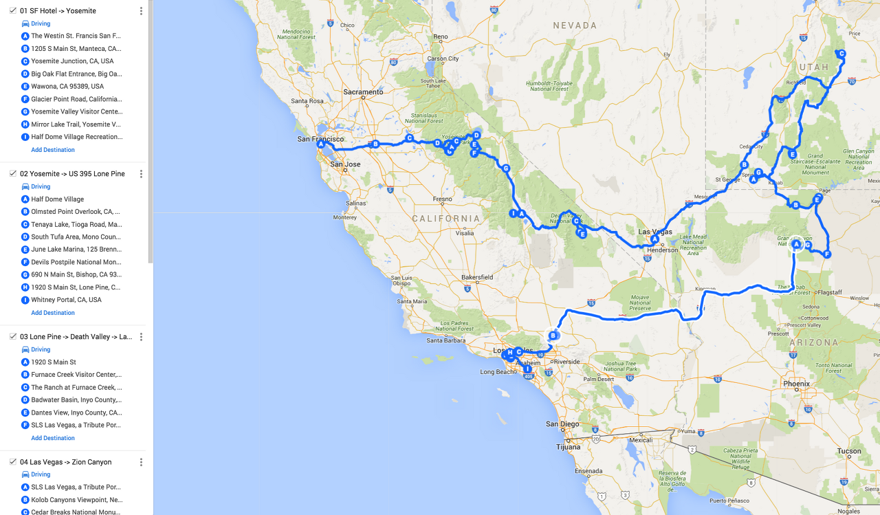 그러나 여러가지 정보를 취합 후 수정한 안은 다음과 같이 변경되었다. - SFO (2일) → Yosemite (1일) → Zion & Bryce Canyon -> Las Vegas(2일) → Death Valley → Grand Canyon(1일) → 중간지점(1일) → LA (3일)