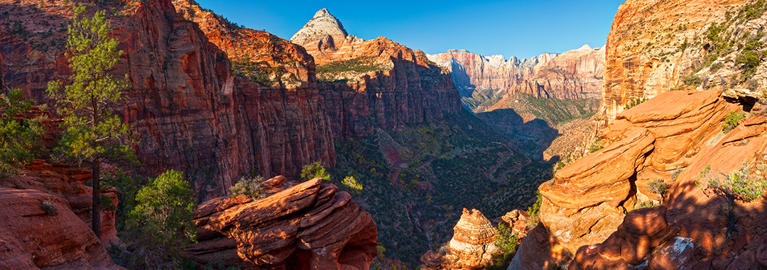 Panoramic photo of the view from the Zion Canyon Overlook in Zion National Park, Utah.