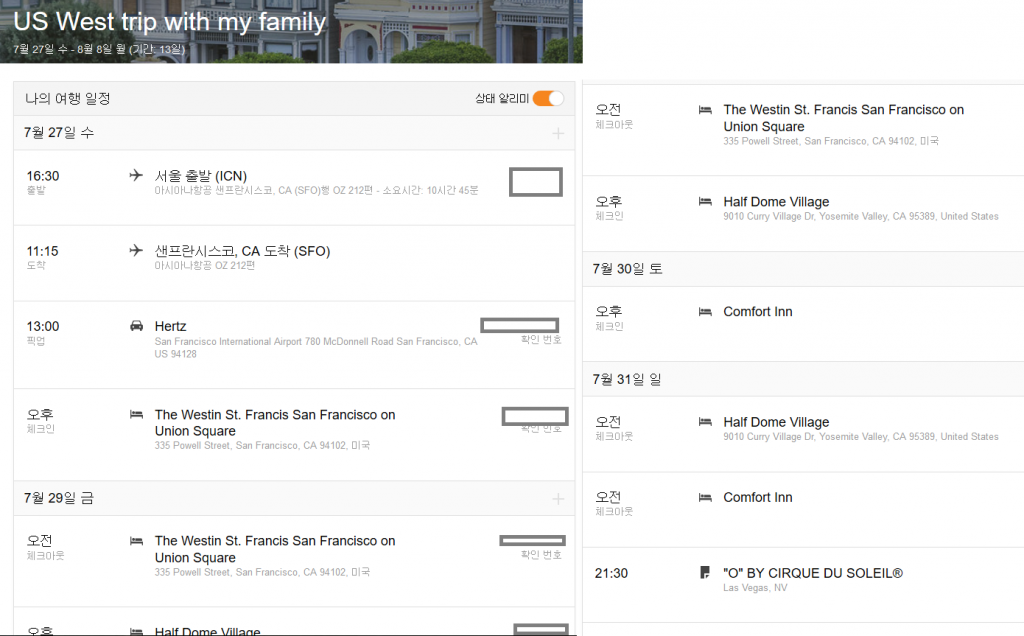 이번 여행을 준비하면서 여행어플이 무엇이 있으며 나 에게 어떤 것이 맞는지 모르겠다. 그 중에 인지도가 높은 두 가지 어플을 선택하여 사용해 보았다. Tripit.com 이나 Kayak.co.kr 에서 제공하는 여행일정을 일목요연하게 보여주는 정보앱들이 있는데 미국 여행에서는 Tripit.com 에서 제공하는 앱이 훨씬 평이 좋은 것같다. 훨씬 디테일하게 정보를 제공하는것 같다. 그러나 이 프로그램의 문제점은 한글 예약정보는 인식을 하지 못한다는 것 이다.