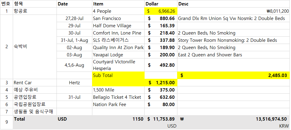 • SFO (2일) → Yosemite (1일) → Zion & Bryce Canyon -> Las Vegas(2일) → Death Valley → Grand Canyon(1일) → 중간지점(1일) → LA (3일)