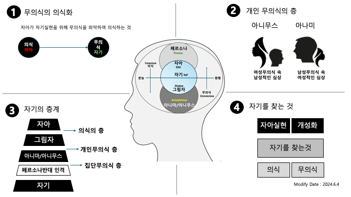 프로이트의 무의식은 병리적인 충동의 저장소 였다면 융의 집단무의식은 긍정적이고 창조적인 나, 진정한 내가 되어가는 과정이며 융은 그것을 자기실현 즉 개성화 과정이라고 했다. 결국 모든 것은 나 자신에게 있다는 것이 융의 분석심리학의 핵심이자 개성과정의 완성이다.